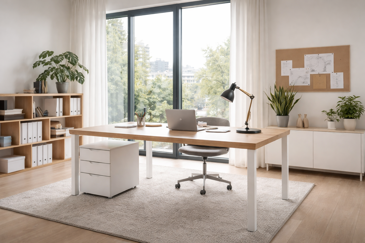 A bright, minimalist workspace with a clean desk, natural light, and organised shelves, creating a calm environment that supports focused and competent work.